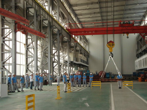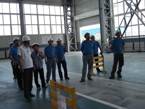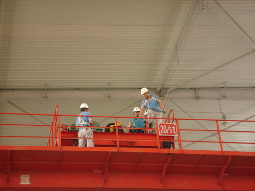 此次預演活動的主要內(nèi)容是,吊車在運行過程中突然停電后工作人員的應變能力。演習開始了,首先,停電后吊車工先把開關手柄放置到“零位”并監(jiān)控總電源。同時,生產(chǎn)部裝配班、物流班部分員工在各自科長的帶領下在吊運物件下設護欄并監(jiān)護,以防有人誤進危險區(qū)域。其次,生產(chǎn)技術部維修人員按照安全操作規(guī)程,爬上吊車走臺,盤車移動到合適位置然后慢慢拉、合抱閘把物件送回地面。最后,解除危險。